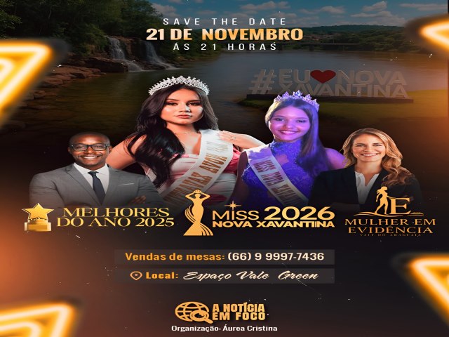 A aguardada cerimônia dos Melhores do Ano de 2025 já tem data marcada: será realizada no dia 21 de novembro, às 21 horas, no Vale Green, em Nova Xavantina. O evento contará com cerimônia de premiação, jantar especial e a eleição da nova Miss Nova Xavantina 2026, que receberá uma premiação de R$ 7.000. As inscrições para o concurso já estão abertas.