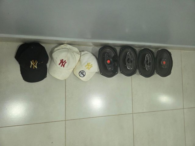 Do local foram subtraídos quatro alto-falantes automotivos da marca Pioneer, avaliados em R$ 220 cada par, além de 20 bonés de diversas marcas, que estavam guardados em uma bolsa para serem comercializados.