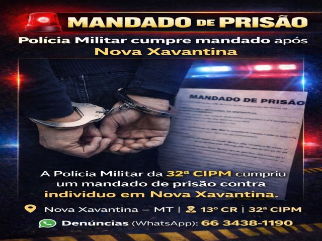 A Polícia Militar de Mato Grosso, por meio do 13º Comando Regional de Água Boa e da 32ª Companhia Independente de Polícia Militar de Nova Xavantina, cumpriu um mandado de prisão na segunda-feira (9).