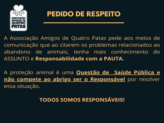 Na nota, a Associação Amigos de Quatro Patas faz um pedido de respeito aos meios de comunicação, destacando que a forma como a pauta do abandono animal foi tratada no programa de rádio foi irresponsável e sem conhecimento de causa, o que acaba gerando cobranças indevidas, desinformação e desgaste aos voluntários.